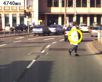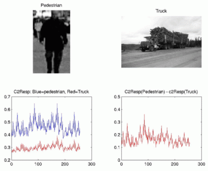 In this study, we combine our saliency-based bottom-up attention model with the HMAX model of object recognition from Riesenhuber and Poggio at MIT. Our attention system determines interesting locations, and feeds only a small cropped region of the image around those locations to the recognition module. The recognition module then determines whether there is a pedestrian in the image region it received. Our preliminary results indicate that combining those two neuromorphic vision models, one concerned with localization of targets and the other with their identification, may yield a very powerful scene analysis model. Florence Miau obtained some very interesting preliminary results on this project, as described in her IEEE EMBS paper and her SPIE paper. |