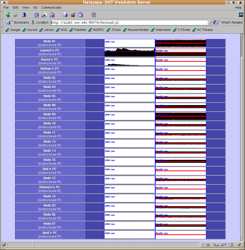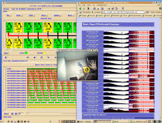 ![]() | We are developing a parallel implementation of our bottom-up saliency-based attention algorithm. The first prototype implementation ran at 15 frames/s for 320x240 resolution on our 16-CPU Beowulf cluster. It used PVM (Parallel Virtual Machine, from Oak Ridge National Laboratory) to spread processing across the CPUs linked by our channel-bonded 3x100Mbps network. And it worked! But we wanted to go faster. So we developed our own direct TCP transport library in C++ and now achieve real-life transfer rates >205Mbps (PVM transfers at 30Mbps over our 3x100Mbps network, almost a 10-fold slowdown). Check out the current implementation (6 MB mpeg), which runs at a full 30 frames/s with a latency of just 2 frames (i.e., each frame is fully processed over the Beowulf in 60ms). For this demo we have disabled the inhibition-of-return, so the the model just keeps focusing on the most salient object in the scene, rather than scanning the scene in order of decreasing saliency. Currently, the CPU and net loads are very low with the algorithm running at 320x240 @ 30 fps, so we have a lot of room on our Beowulf to grow the algorithms! Check out this new movie (12 MB MPEG) that includes a channel sensitive to flicker (also see below), and allows the algorithm to pickup salient moving objects, while remaining largely insensitive to camera motion (notice how the most salient location remains quite stable when the camera is jerked around). In this movie also, inhibition-of-return was disabled, so that the system keeps focusing on the most salient location in the visual field, rather than quickly scanning several locations in order of decreasing saliency. |