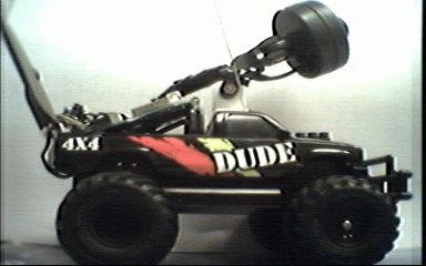 We are exploring the uses of our bottom-up visual attention algorithm in the guidance of an autonomous vehicle with a small video camera as its only sensor. Currently, the vehicle is radio-controlled, and video is sent to our 16-CPU Beowulf cluster through a 2.4GHz wireless link. This vehicle is the smallest off-road toy vehicle we could find, about 10cm in overall length (the diameter of the camera module mounted on top is just slightly larger than a US quarter dollar coin. Watch its first exploratory trip around the building in this MPEG movie (7.3MB) and note how it easily finds all interesting landmarks even though the blue channel was lost during this recording, hence the yellowish aspect of the movie. (Make sure you use a fast player - the time counter in the top-left corner should increment by 5ms steps when no frames are dropped). After successful trials using the small radio-controlled car shown here, we have decided to start a larger-scale project, the Beobot Project. |