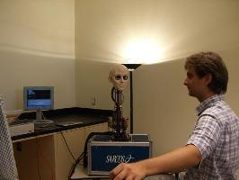 This is a simple demonstration which we put together with robotics experts from Stefan Schaal's laboratory for the Robot Exposition and Open House at the National Science Foundation on September 16, 2005. Zach Gossman, an undergraduate student at iLab, wrote the code for this demo. A stripped-down version of our saliency-based visual attention code runs in real-time on a portable workstation with a single dual-core processor. Video inputs are digitized from cameras in the eyes of the robot and processed at 30 frames/s. Saliency maps are computed, highlighting in real-time which locations in the robot's surroundings would most strongly attract the attention of a typical human observer. At any given time, the coordinates of the most active locations are then transmitted to the robot head's motor control system, which then executes a combination of rapid (saccadic) eye movements and slower (smooth pursuit) eye and head movements. | ![]() |