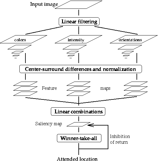 The original architecture (Itti, Koch & Niebur, IEEE PAMI, 1998) shown below: