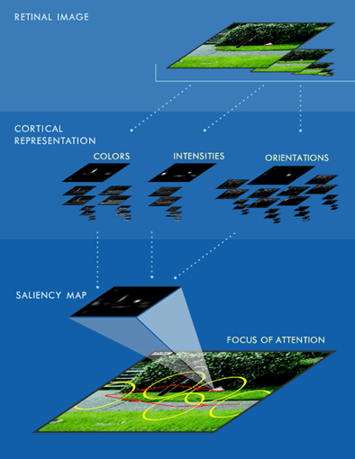We here present a brief overview of our model for the bottom-up control of visual attention in primates. Given an input image, this systems attempts to predict which location in the image will automatically and inconsciously your attention towards them