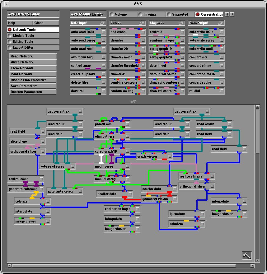 The software consists of over 300 processing modules and over 250 networks of such modules, written in AVS. It includes, among others, custom automated algorithms for skull stripping, surface-based coregistration, segmentation of CSF, correction for partial volume effects in SPECT/PET/pMRI, coregistration of MRS to MRI allowing accurate MRS localization on follow-up scans, MRI morphometry and drawing of regions of interest, extraction of white-matter lesions, correction for MRI intensity decay with surface coils, correction for geometric distortions and patient motion in EPI-fMRI, sparse fusion of fMRI time series across sessions, computation of fMRI activation, computation of blood flow in Gd-pMRI, elimination of large vessels in pMRI, computation of diffusion tensor in dMRI, 3D surface mesh reconstruction and optimization, and various 2D and 3D visualization tools, classical image processing tools and image conversion tools.