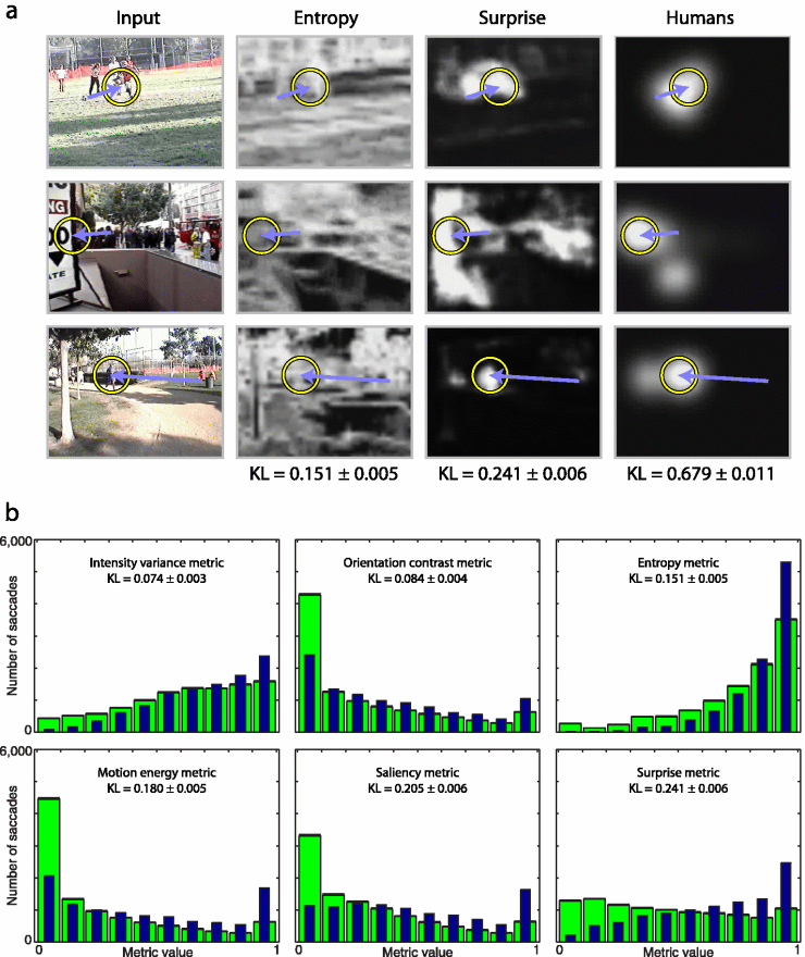 | The concept of surprise is central to sensory processing, adaptation and learning, attention, and decision making. Yet, until now, no widely-accepted mathematical theory existed to quantify surprise elicited by stimuli or events, for observers ranging from single neurons to complex natural or engineered systems. In work in collaboration with Prof. Pierre Baldi at the University of California at Irvine, we have developed a formal Bayesian definition of surprise that is the only consistent formulation under minimal axiomatic assumptions. Bayesian surprise quantifies how data affects natural or artificial observers, by measuring differences between posterior and prior beliefs of the observers. Using this framework we tested whether humans orient their gaze towards surprising events or items while watching television. Bayesian surprise strongly attracts human observers, with 72% of all gaze shifts directed towards locations more surprising than the average, a figure rising to 84% when considering only gaze targets simultaneously selected by all subjects. The resulting theory of surprise is applicable across different spatio-temporal scales, modalities, and levels of abstraction. | ![]() |