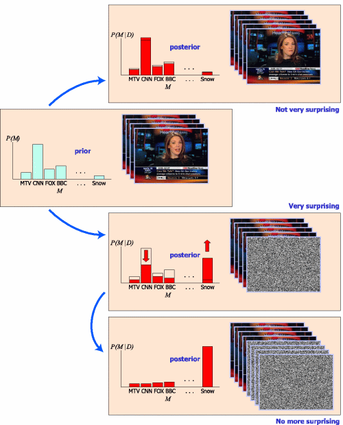 To illustrate how surprise arises when data is observed, consider a human observer who just turned a television set on, not knowing which channel it is tuned to. The observer has a number of co-existing hypotheses or models about which channel may be on, for example, MTV, CNN, FOX, BBC, etc. (figure). Over the course of viewing the first few video frames of the unknown channel (here, CNN), the observer's beliefs in each hypothesis adjust, progressively favoring one channel over the others (leading to a higher prior probability for CNN in left panel). Consider next what happens if yet another video frame of the same program is observed (top right), intuitively an unsurprising event. Through Bayesian update, the new frame only minimally alters the observer's beliefs, with the posterior distribution of beliefs over models showing a slightly reinforced belief into the correct channel at the expense of the others. In contrast, if a frame of snow was suddenly observed (middle right), intuitively this should be a very surprising event, as it may signal storm, earthquake, toddler's curiosity, electronic malfunction, or a military putsch. Through Bayesian update, this observation would yield a large shift between the prior and posterior distributions of beliefs, with the posterior now strongly favoring a snow model (and possible associated earthquake, malfunction, etc. hypotheses), correspondingly reducing belief in all other television channels. In sum, unsurprising data yields little difference between posterior and prior distributions of beliefs over models, while surprising data yields a large shift: in mathematical terms, an event is surprising when the distance between posterior and prior distributions of beliefs over all models is large. |
